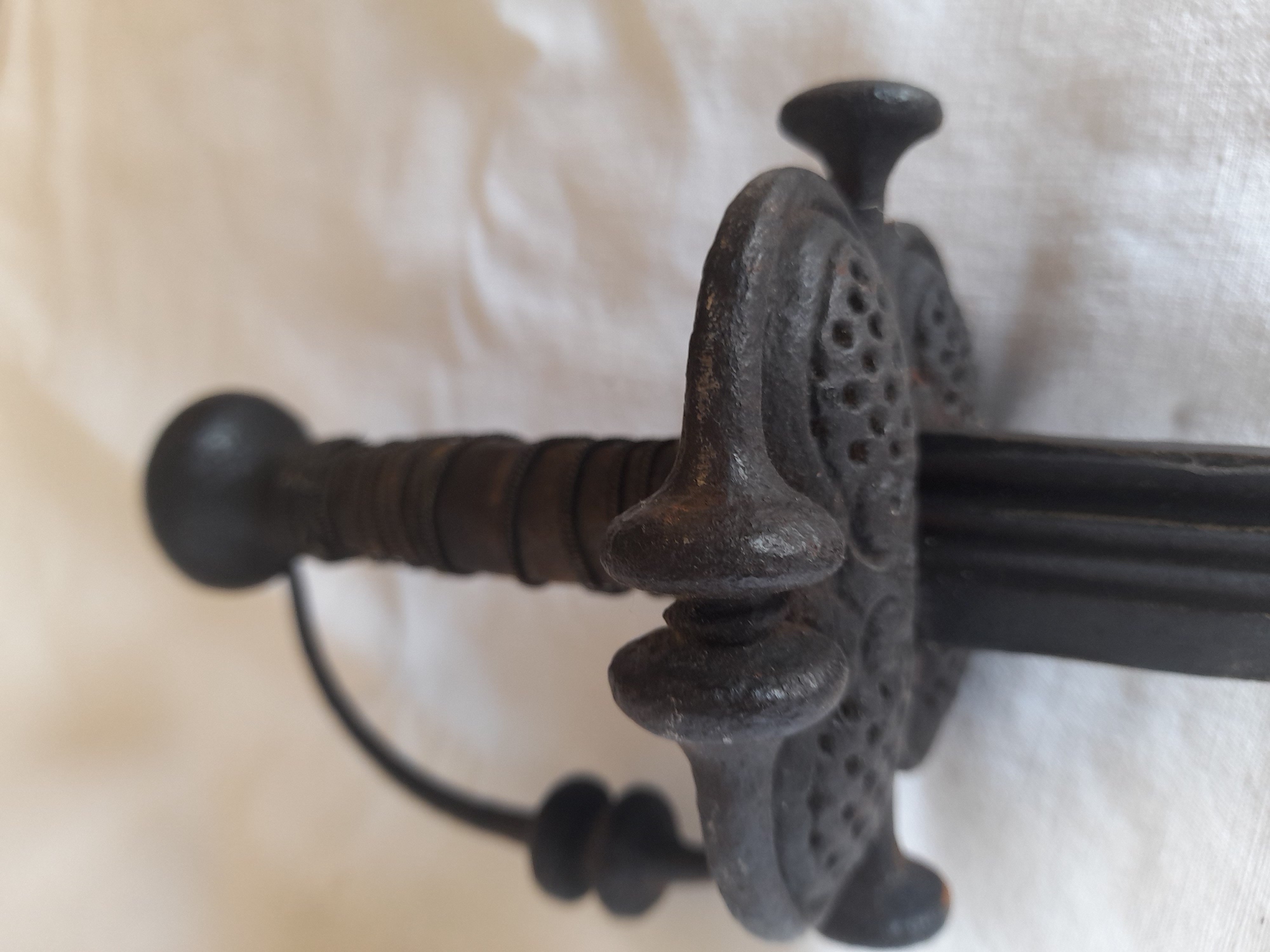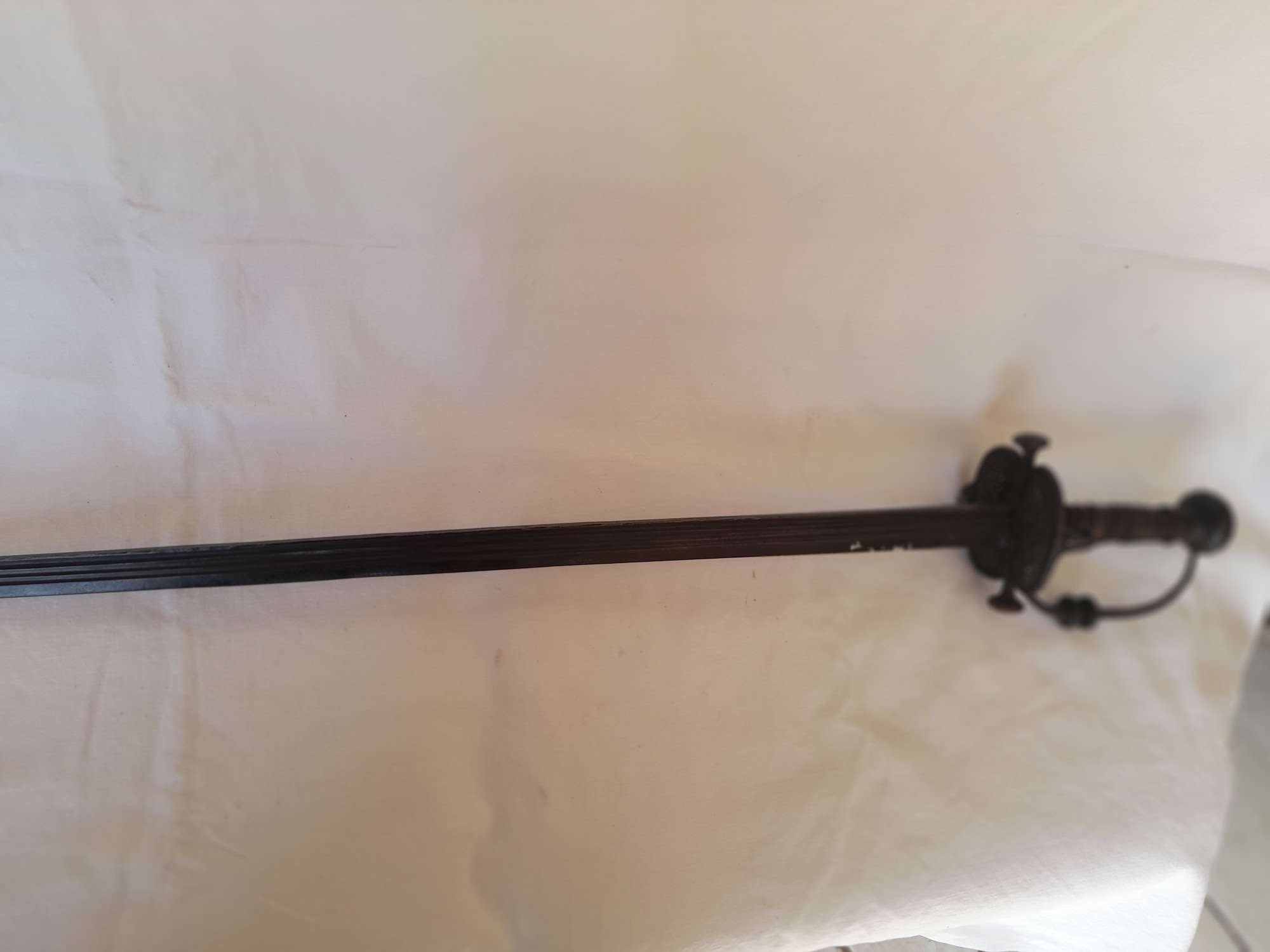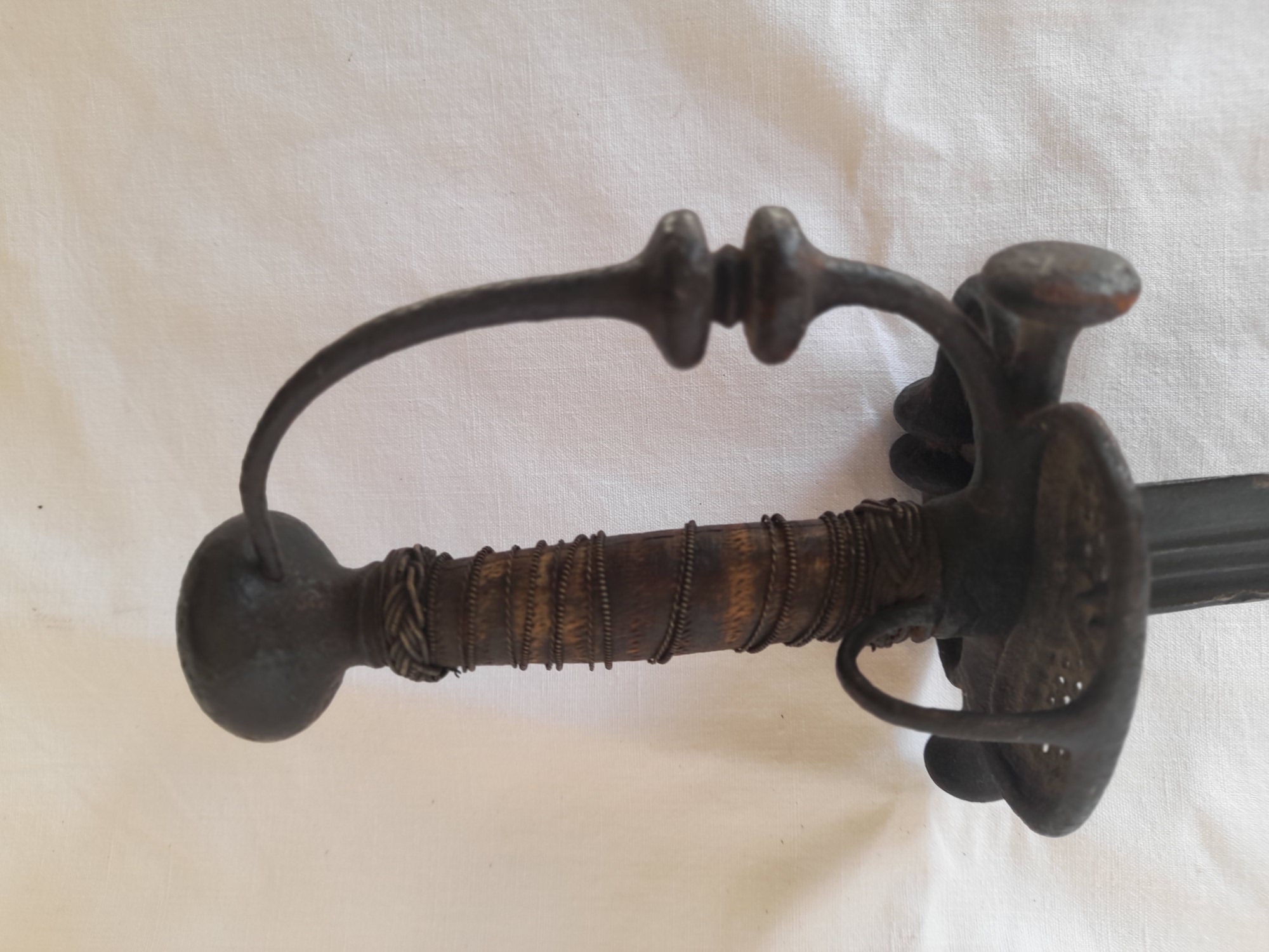 Epée walonne d officier double pontat 17 eme s. lame droite a 3 gorges manque en partie au filigrane dans son jus de decouverte.