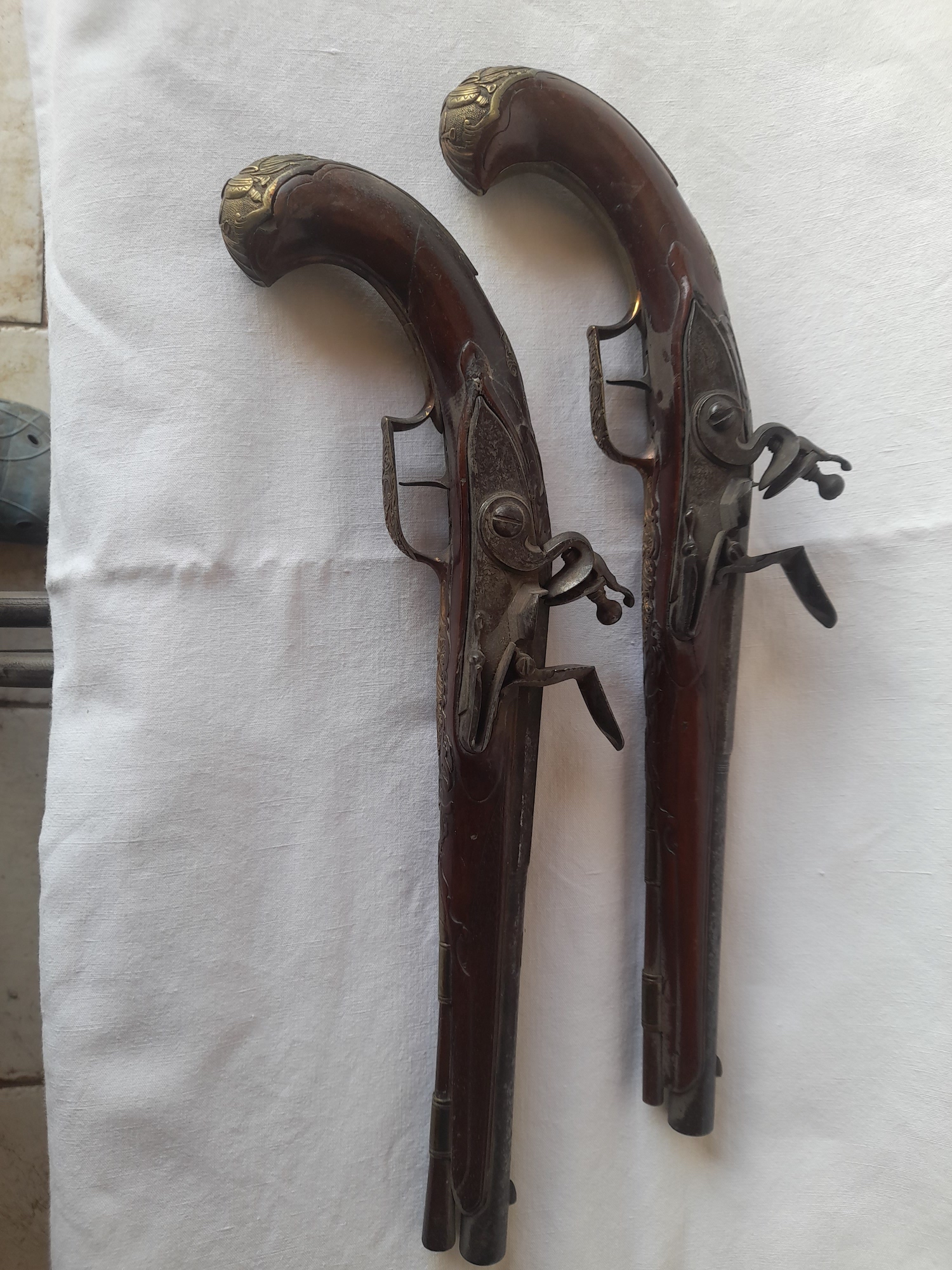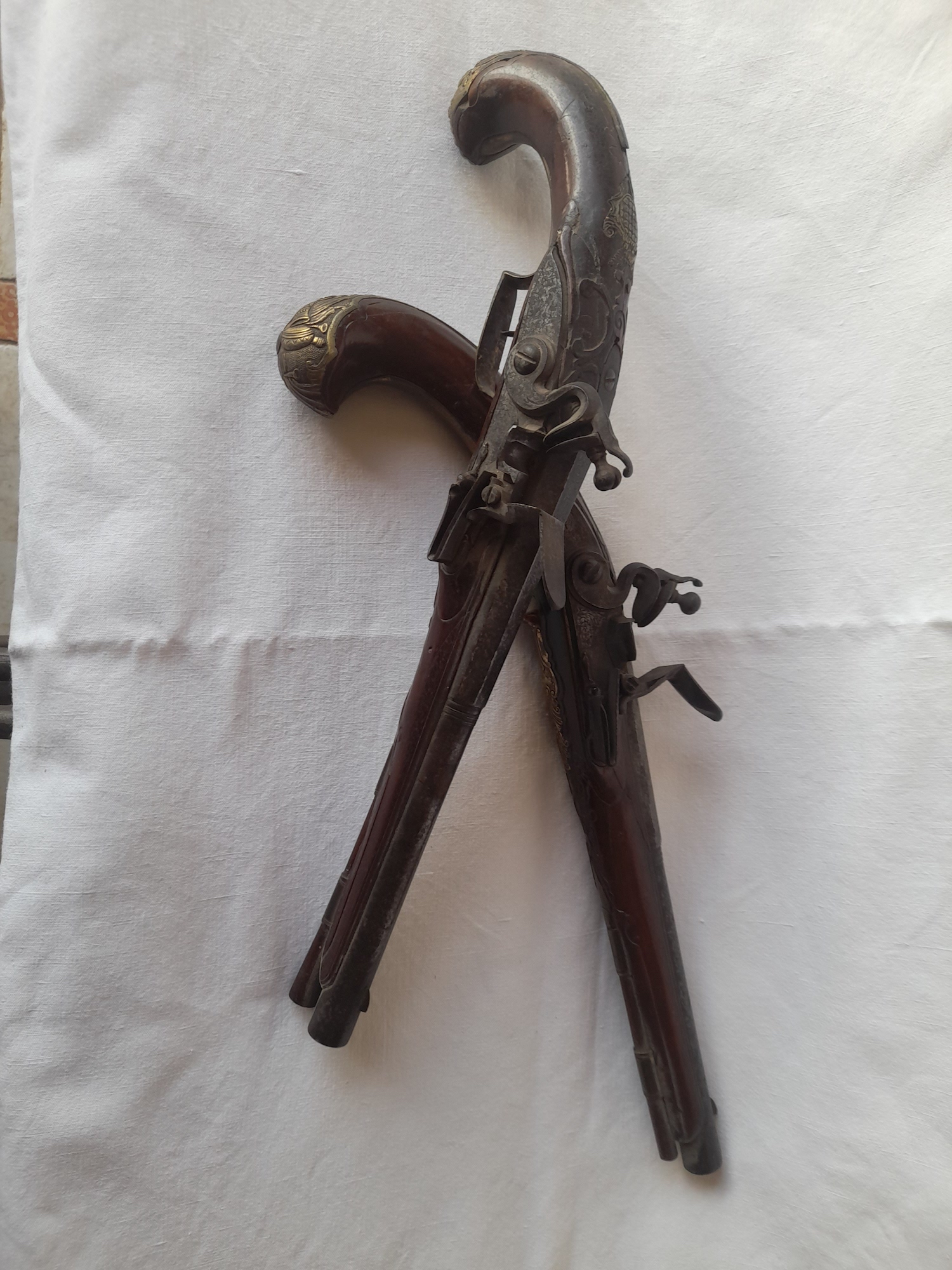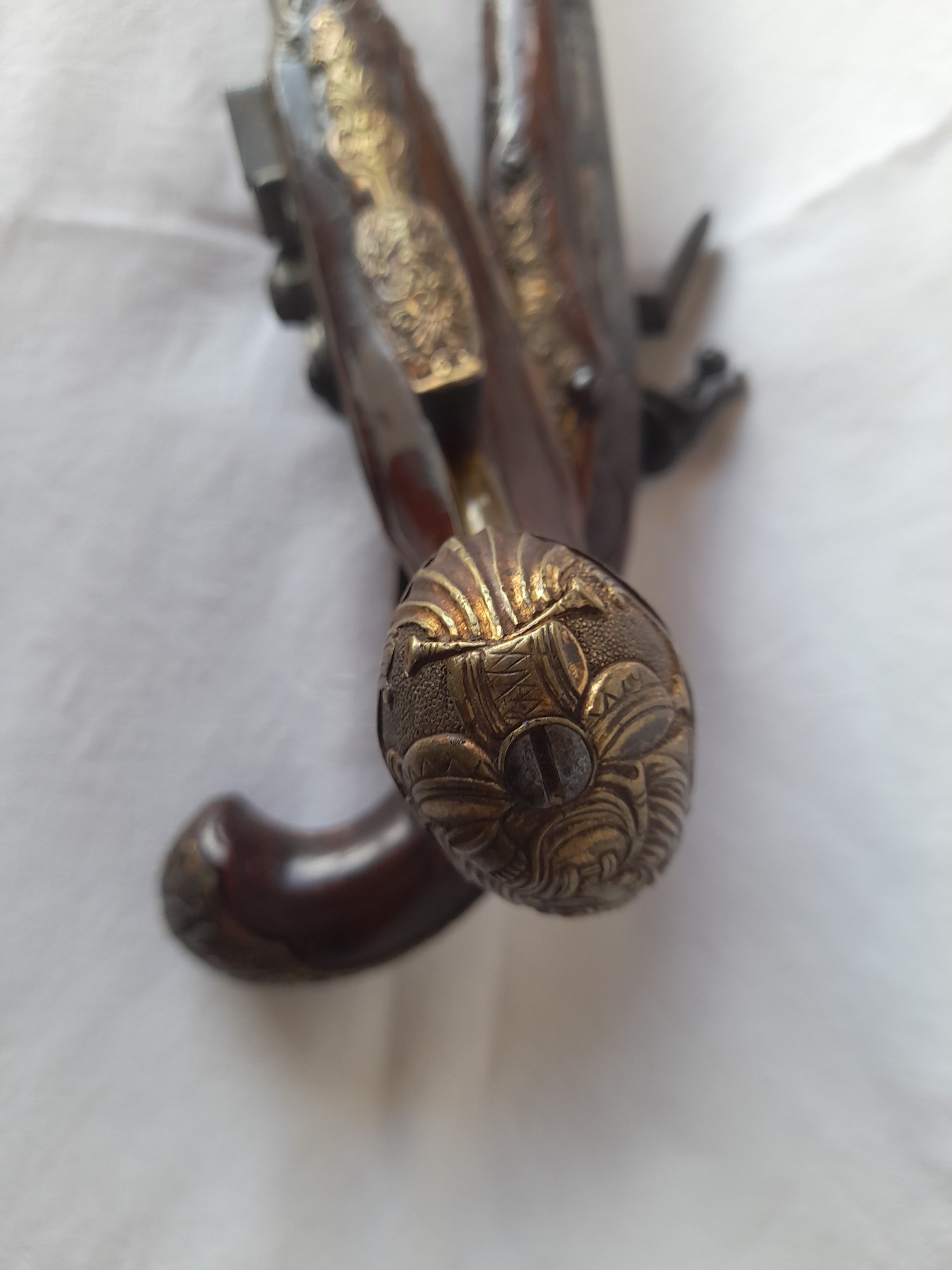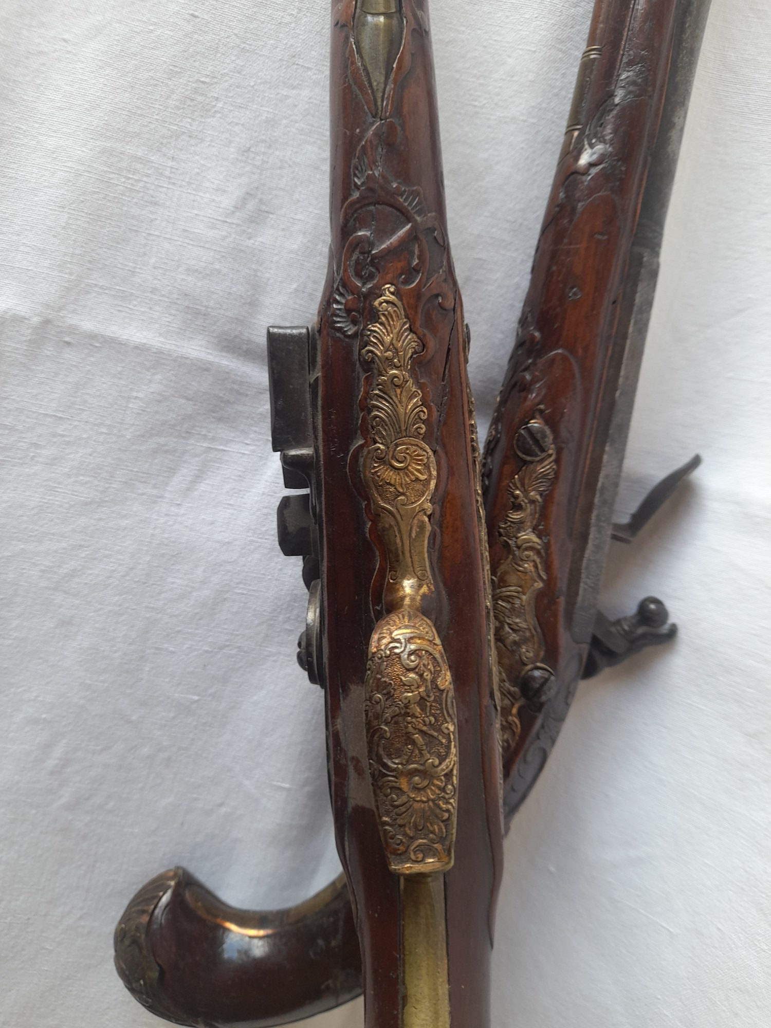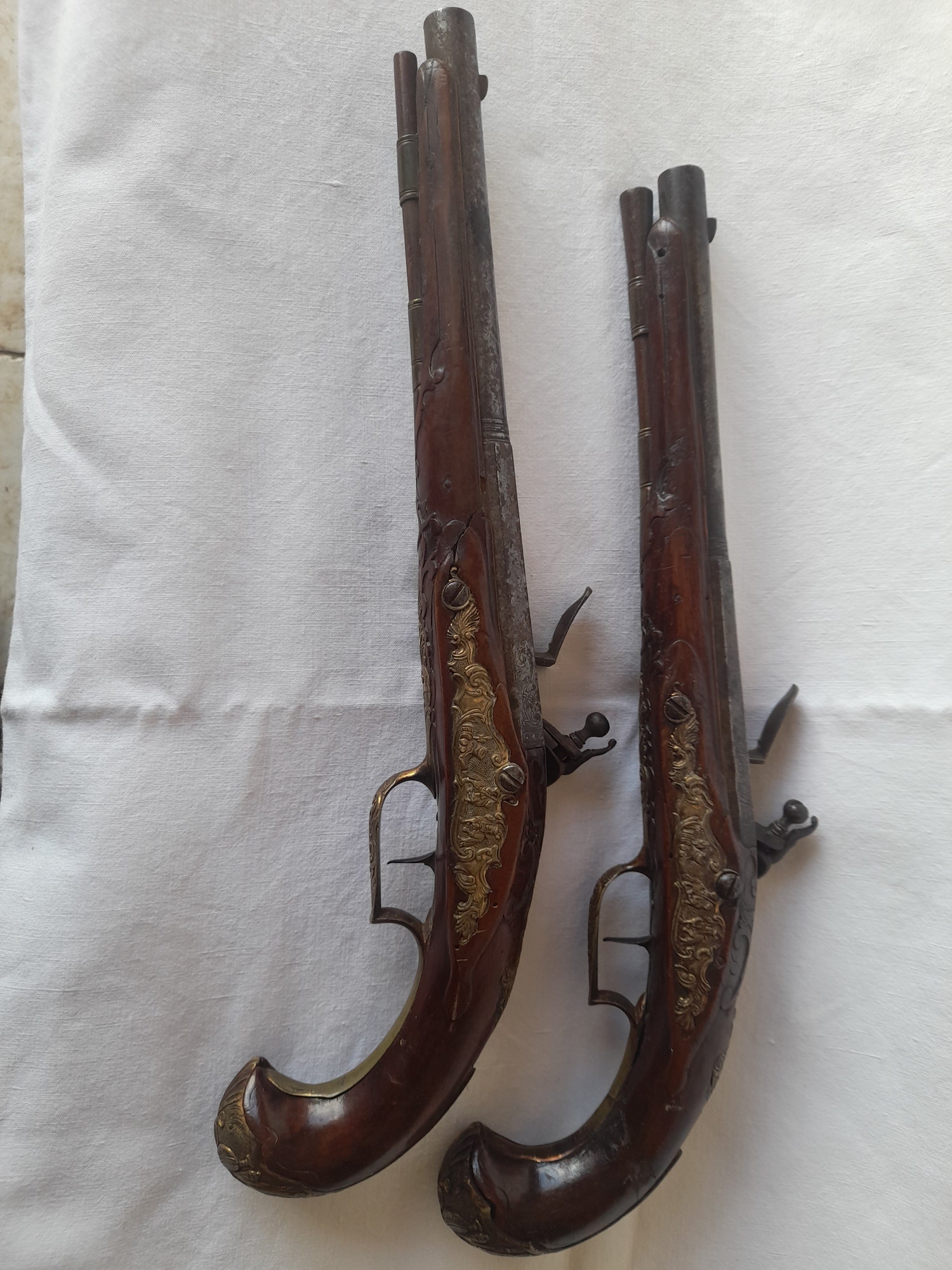 Paire de pistolets a silex,riche garniture en bronze doré, canon a deux registres ,crosse fendue a l un recolle anciennement,epoque 18 eme siecle Long.totale,40 cm.environ. Prix.1900.€.
